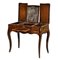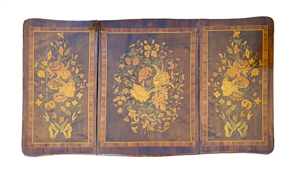 Toilette lastronata e intarsiata in legni vari a motivi floreali, piano tripart