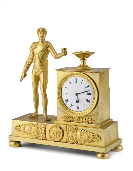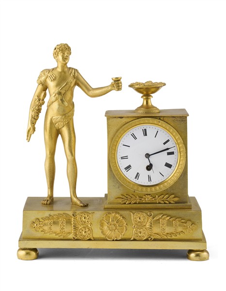 Orologio da scrivania con cassa del secolo XIX in bronzo dorato sormontata da Bacco a tuttotondo. Quadrante in smalto bianco a numeri romani, movimento solo tempo a bilanciere del secolo XVIII. Francia (h. cm 18,5) (difetti e sostituzioni)