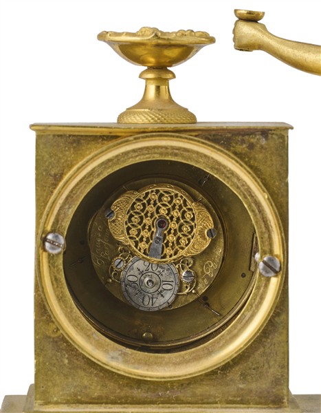 Clock with a gilded bronze 19th century case surmounted by Bacchus. White enamel dial with roman numerals, balance wheel movement from the 18th century. France (h. cm 18,5) (defects and substitutions)