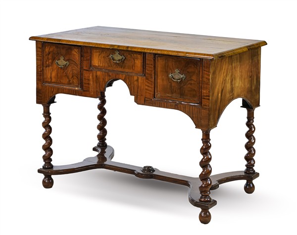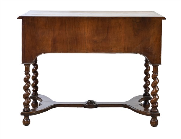 Scrittoio da centro lastronato in mogano con fronte a tre cassetti e gambe tortili raccordate da crociera. Inghilterra, secolo XIX (cm 104,5x82x62) (difetti e restauri)