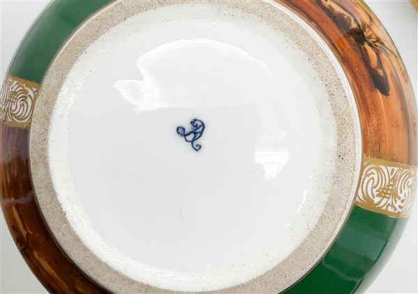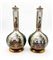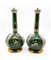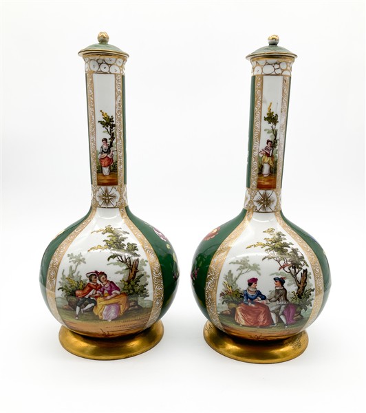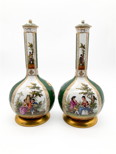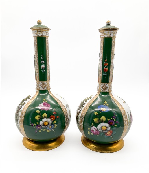 Manifattura del secolo XIX. Coppia di bottiglie con tappo in porcellana policroma dipinta a scene galanti e fiori su fondo verde, profili in oro. Marcati sotto la base (h cm 33) (restauri ai coperchi)