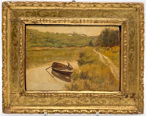 Ignoto dellla seconda metà del secolo XIX "Scorcio fluviale con barca" olio s