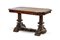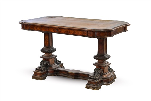 Scrittoio da centro in legni vari con piano sagomato, doppio sostegno a balaustro raccordato da traversa decorato da intaglio a foglia, un casseto nella fascia. Fine secolo XIX (135x76x91) (difetti e mancanze)
