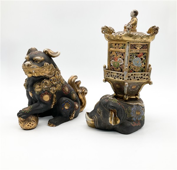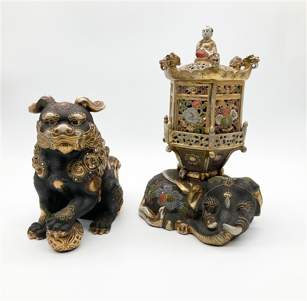 Lotto composto da un incensiere in forma di elefante su cui poggia una lanterna traforata ed un cane di Pho in porcellana Satsuma