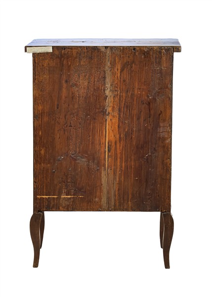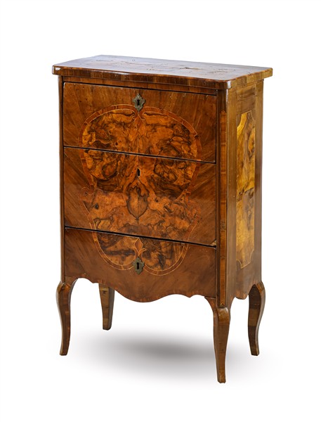 Comodino in noce con specchiatura in radica, fronte a tre cassetti e piedi mossi. Lombardia, secolo XVIII (cm 55x82x30) (difetti e restauri)