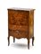 Comodino in noce con specchiatura in radica, fronte a tre cassetti e piedi moss