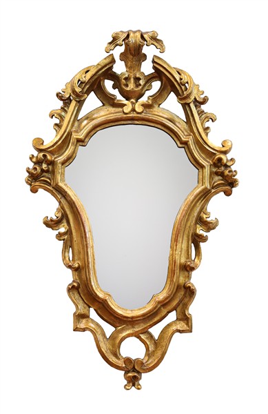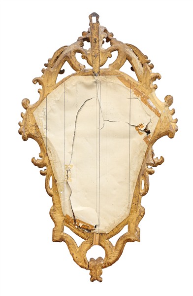 Specchierina in legno intagliato e dorato di forma sagomata con cimasa e grembiale traforati a volute spezzate e fogliate. Bologna, secolo XVIII (cm 80x49) (difetti)