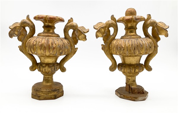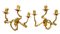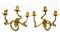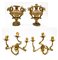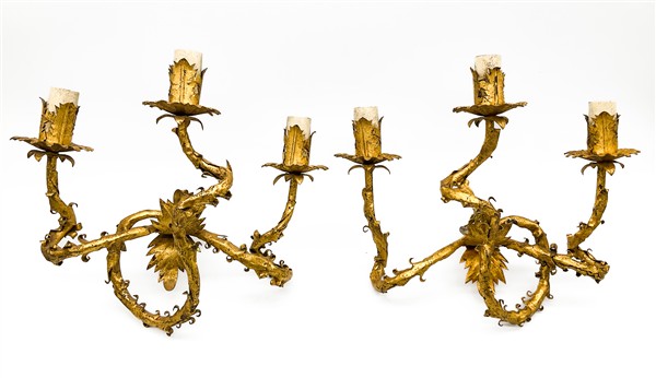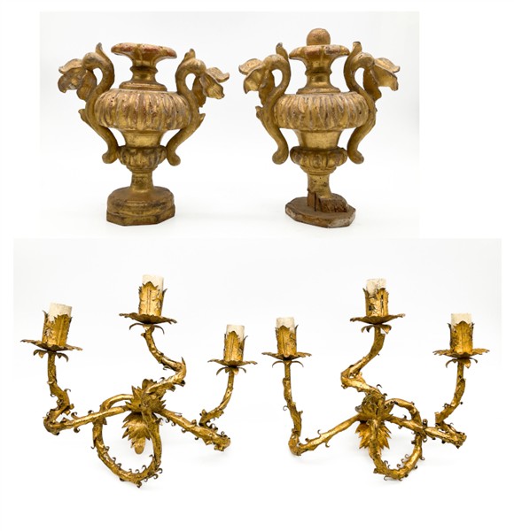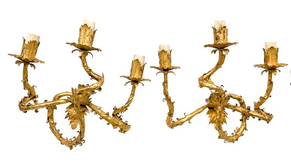 Lotto composto da coppia di applique a tre luci in ferro ritorto e lamierino dorato con decori a foglie e coppia di portapalme biansate in legno intagliato e dorato. Secolo XVIII-XIX (cm 29x28) (difetti e mancanze)