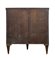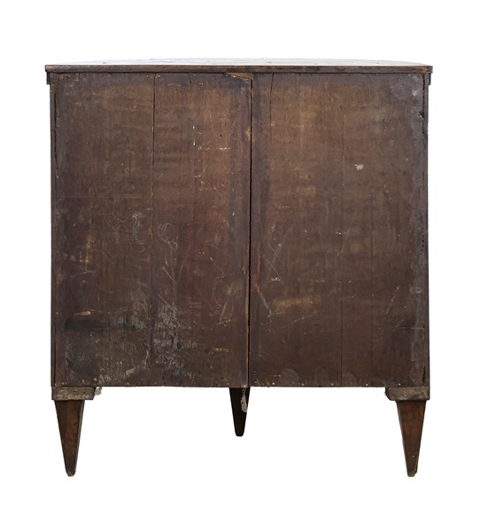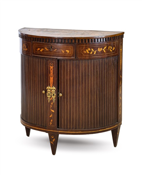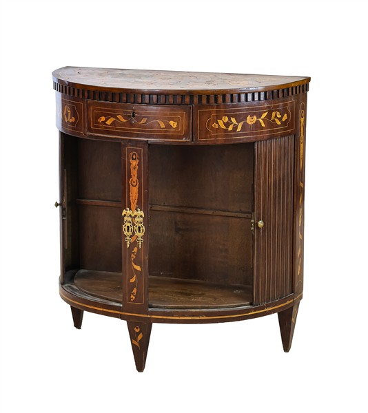 Mobiletto a demi-lune in mogano intarsiato in legni chiari a motivi floreali, fronte con cassetto nella fascia e doppia serrandina. Olanda, secolo XIX (cm 78x82x40) (difetti)