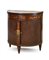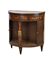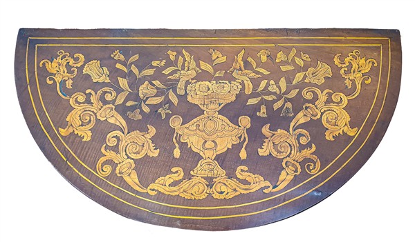 Mobiletto a demi-lune in mogano intarsiato in legni chiari a motivi floreali, f