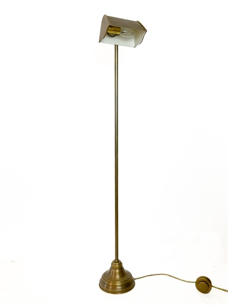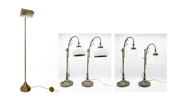 Lotto composto da due coppie di lampade d'appoggio in metallo brunito con paralumi in vetro opalino e una lampada da terra similare (h max cm 110) (difetti)