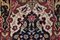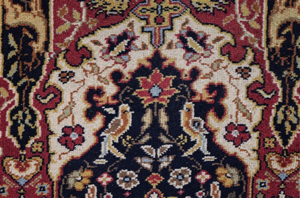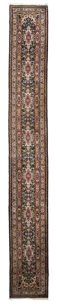 Tappeto passatoia Bucarest, Romania, secolo XX. Decoro con una fila di medaglioni polilobati a fondo bianco su campo blu notte decorato da rami fioriti e volatili. Alle testate due Mirab con cerbiatti su fondo blu notte (cm 710x90) (difetti)