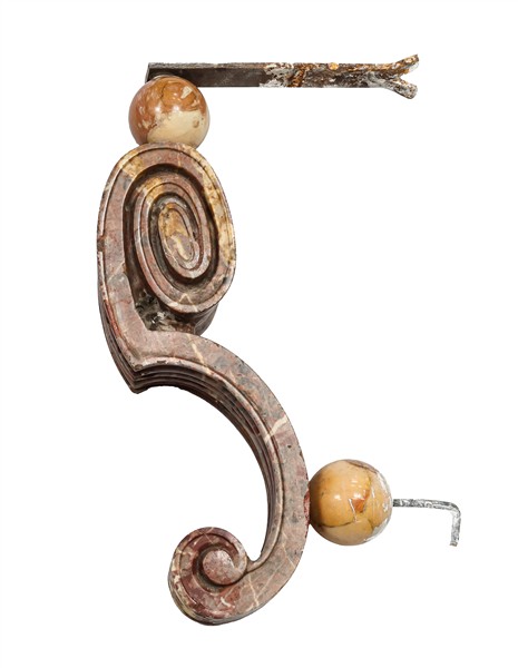 Coppia di mensole in marmi vari con piani sagomati e sostegni a voluta scanalata e sfera (cm 41x33x27) (difetti)
