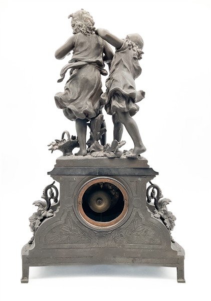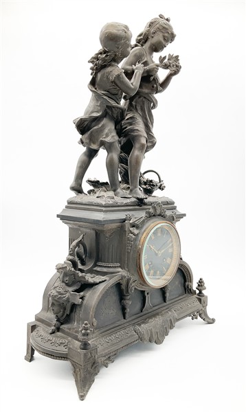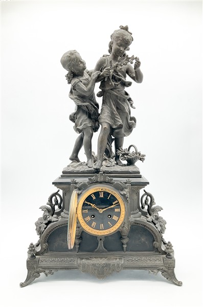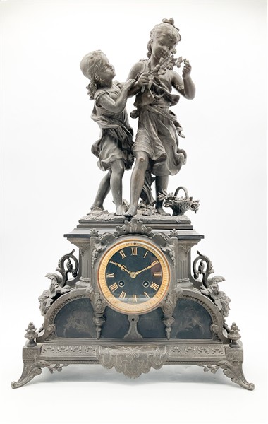 Pendola da appoggio con cassa in metallo patinato e inserti in marmo nero a soggetto bucolico. Quadrante a numeri romani, movimento a due treni con suoneria delle ore e mezze su campanello. Francia, fine secolo XIX (h. cm 59) (difetti e rotture)