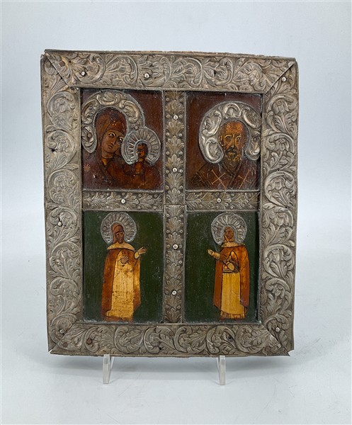 Arte balcanica, secolo XVIII-XIX Icona con tre Santi e la Vergine col Bambino T