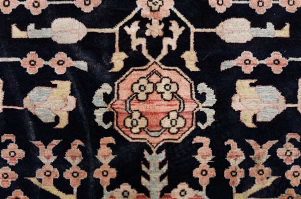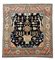 Tappeto Hamadan, Persia, secolo XX. Decoro con vaso fiorito stilizzato su fondo blu notte. Grande bordura con foglie dentate e fiori a fondo rosa (cm 197x197) (difetti)