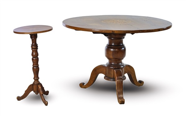 Lotto composto da un tavolo a vela in noce filettato con piano circolare e sostegno tripode (d cm 115, h 71) e un tavolino circolare con sostegno tornito tripode (d cm 38; h 74) (difetti)