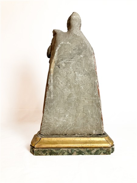 Pietra scolpita con tracce di policromia (h cm 62) su base coeva in legno dipinto a finto marmo e dorato (h tot cm 69,5) (difetti)