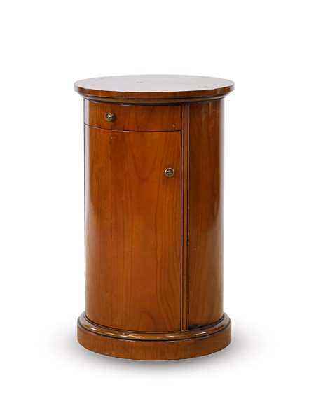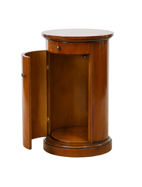 Comodino a colonna con profili ebanizzati, piano circolare con cassettino nella fascia e anta sul fronte. Secolo XX (d cm 44,5: h cm 73) (lievi difetti)