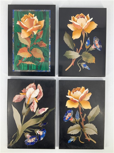 Opificio del secolo XX. Gruppo di quattro placche in commesso di marmi vari e pietre dure raffiguranti fiori, di cui uno su fondo in malachite con cornice in lapislazzuli (cm max 18x12 cad.) (difetti)