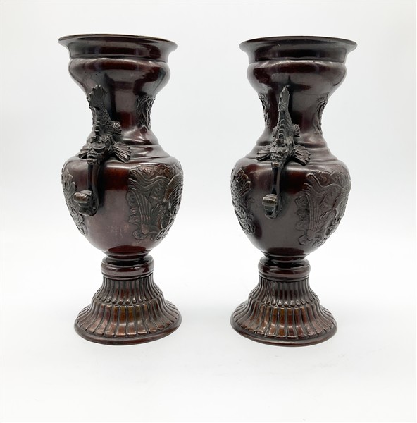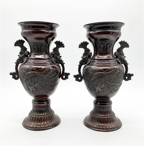 Coppia di vasi a balaustro biansati in bronzo con decori a rilievo, il corpo decorato da fenici tra nuvole, base baccellata, anse a mostri marini