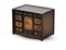 Piccolo monetiere in noce e legni vari con fronte ad un'anta e nove diversi tir