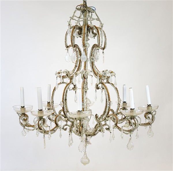 Lampadario a otto luci in metallo sagomato e dorato con bordure perlinate e pendenti in vetro sfaccettato. Secolo XIX (d cm 97, h cm 102) (difetti)