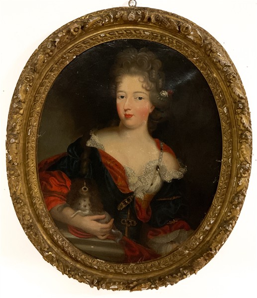 Scuola francese del secolo XVIII "Ritratto di dama con cagnolino" olio su tela