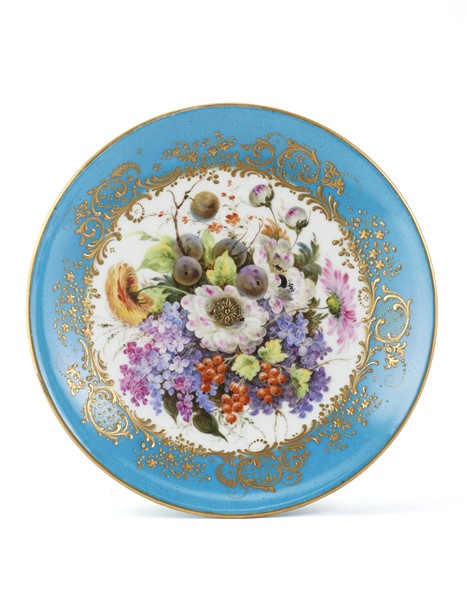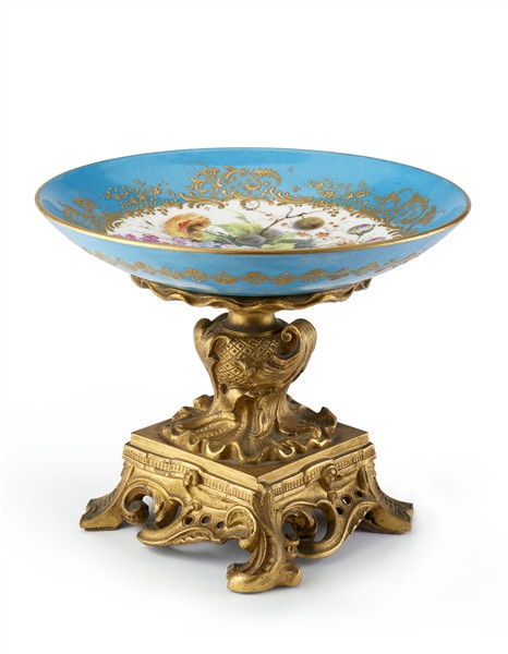 Manifattura francese, secolo XIX. Alzata con piatto in porcellana dipinta in policromia con fiori e frutta entro riserva dorata a girali vegetali su fondo azzurro, poggiante su base in bronzo dorato con fusto a motivi rocaille, base squadrata e traforata (h cm 18) (difetti)
