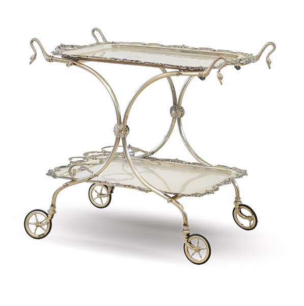 Lot 197 | Carrello a due ripiani in metallo argentato con sostegni terminanti a collo di