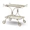 Carrello a due ripiani in metallo argentato con sostegni terminanti a collo di cigno, gambe con rotelle e piano superiore a vassoio biansato amovibile (cm 75x71x49) (difetti e rotture ad una ruota)