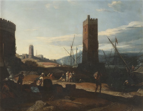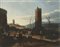 Lot 198 | Scuola del secolo XVIII "Veduta con porto e personaggi" olio su tela (cm 48,5x