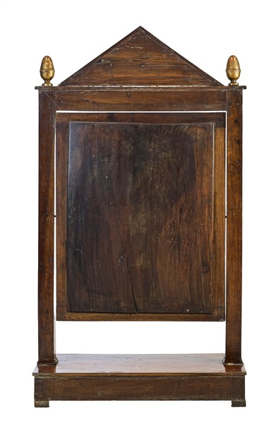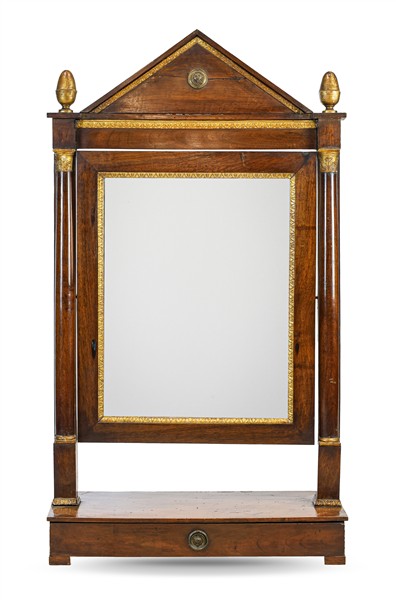 Psiche d'appoggio in noce con specchio basculante e montanti a semicolonna, cimasa a timpano e puntali a pigna, base con cassetto e profili dorati. Secolo XIX. (cm 65x115x27) (difetti)