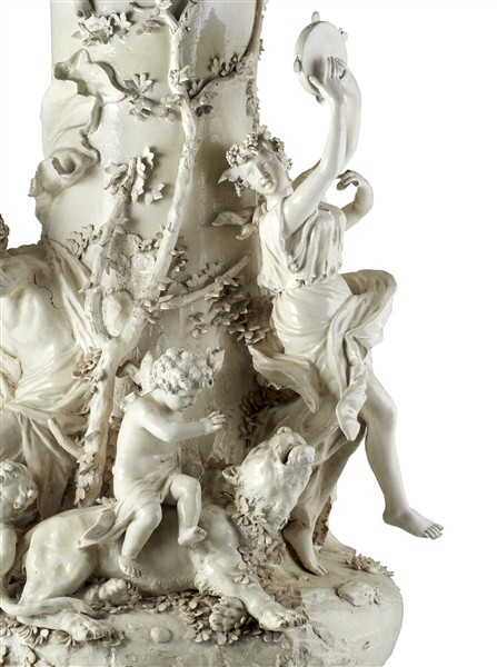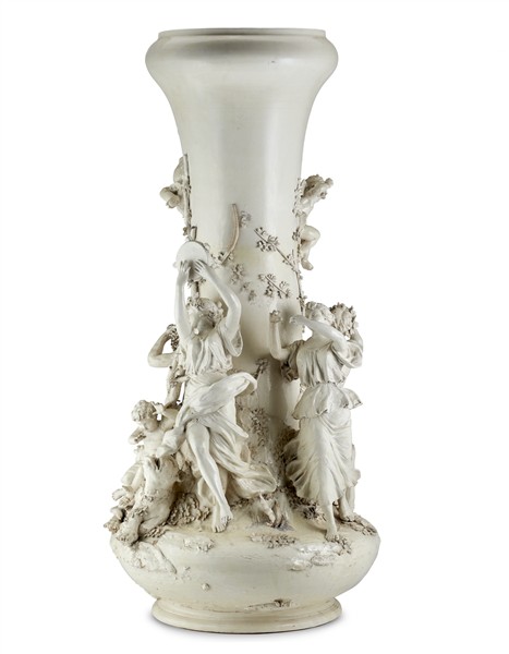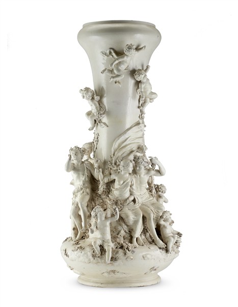 Manifattura italiana, prima metà del secolo XX. Grande vaso in terraglia smaltata bianca, corpo decorato da scena bacchica con figure dionisiache e putti a tutto tondo (h. cm 90) (difetti, mancanze e restauri)