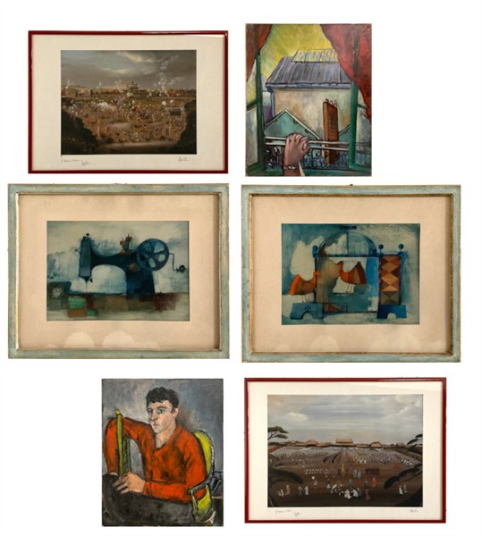 Lotto composto da due dipinti ad olio su tela raffiguranti Paesaggio e Ritratto, uno firmato G. Parenti (cm 60x50), due tecniche miste firmate Rosina e datate 1977 (cm 33x45) e a una coppia di stampe offset di soggetto diverso (cm 49,5x69,5) firmate e dedicate in basso