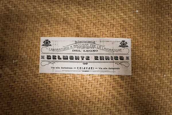 Delmonte Enrico, Chiavari. Quattro diverse sedie chiavarine in legno dorato con schienale a giorno e gambe tornite riunite da traverse. Etichette sotto la seduta (difetti e mancanze)