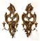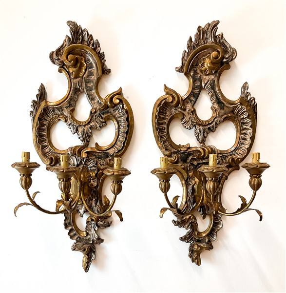 Coppia di applique a tre luci in legno intagliato a foglie e volute, laccato e
