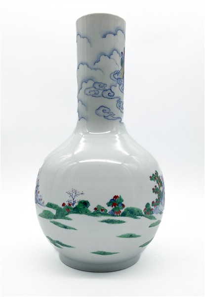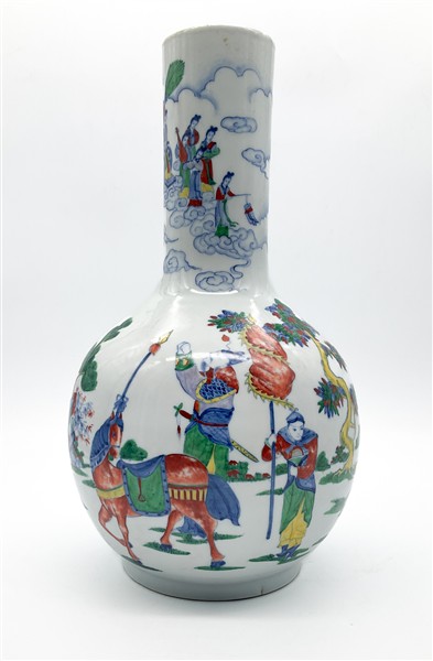 Vaso a bottiglia in porcellana Wucai decorato da figure tra nuvole in un paesaggio in policromia.