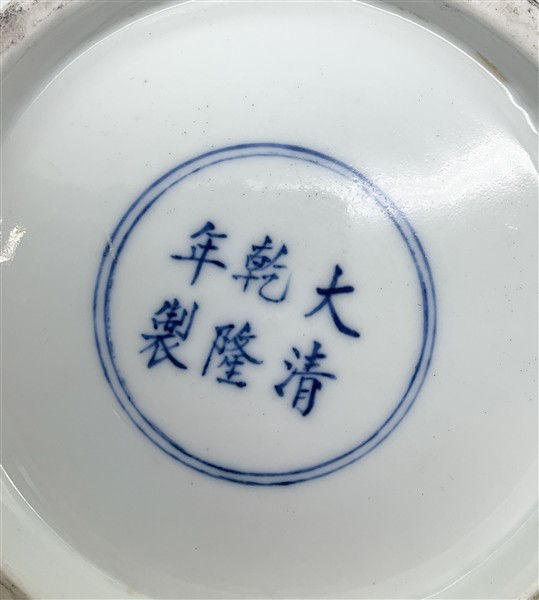 Recante marchio Qianlong apocrifo in blu sotto la base