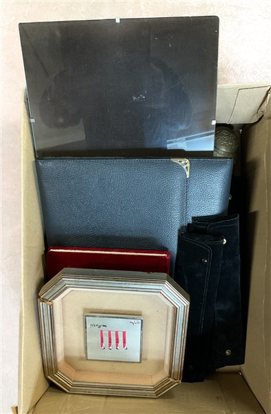 Cartone contenente due multipli moderni su lamina d'argento, alcuni orologi da polso, fermacarte e altri diversi oggetti (difetti)