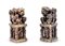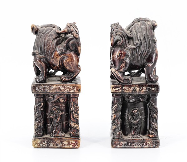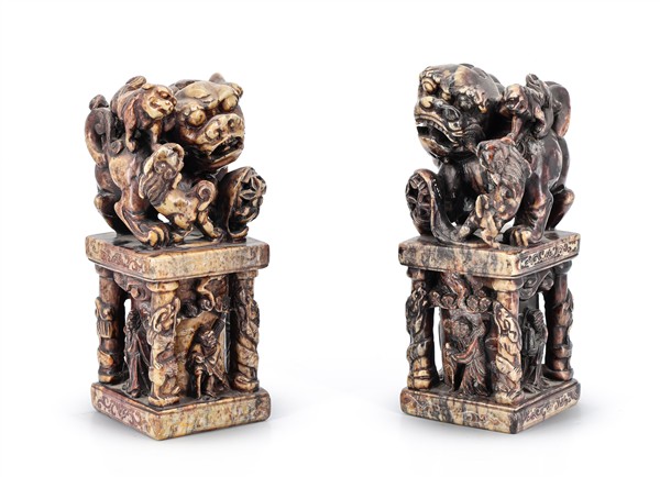 Coppia di sigilli in forma di cani di Pho su sostegno a colonna con figure a rilievo in pietra saponaria