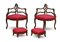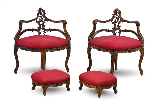 Lotto composto da coppia di poltrone angolari con schienali intagliati e traforati e una coppia di poggiapiedi rivestiti in tessuto rosso (difetti)