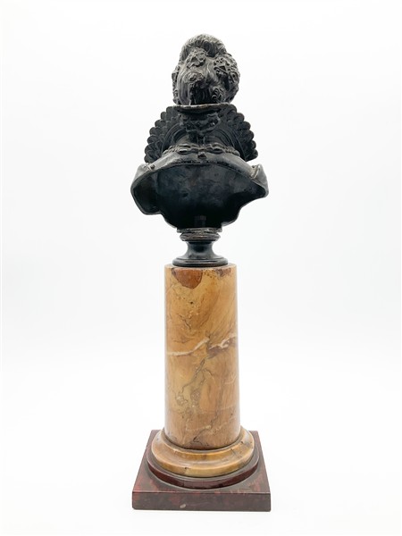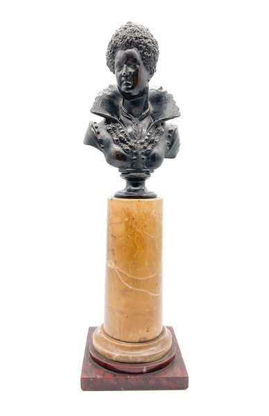 Piccolo busto in bronzo raffigurante Maria de Medici regina di Francia (h cm 23) montato su colonna in marmo giallo poggiante su base quadrata in marmo rosso (h tot cm 47,5) (difetti)