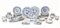 Manifattura cecoslovacca, secolo XX. Parte di servizio da tavola in porcellana decorata in blu al fiore di cipolla. Composto da otto piatti piani, quattordici fondi, nove piattini, una insalatiera, una salsiera, un piatto da portata tripartito con ansa, sei mezzaluna, sei piatti da portata di diversa forma, sei tazze da brodo con piatto, sei tazze da tè, alcune tazzine e piattini, zuccheriera (difetti)