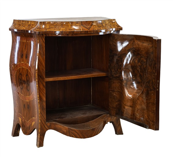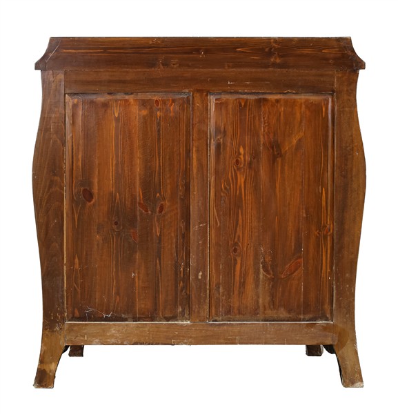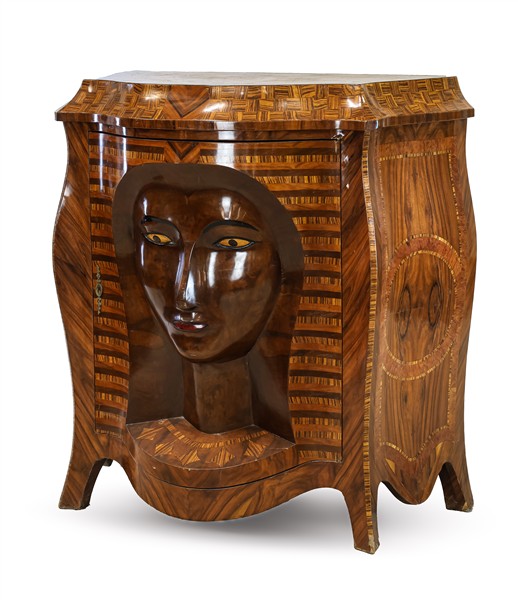 Credenza di forma sagomata con anta a volto femminile egizio. Seconda metà secolo XX. (cm 61x110x60) (difetti)