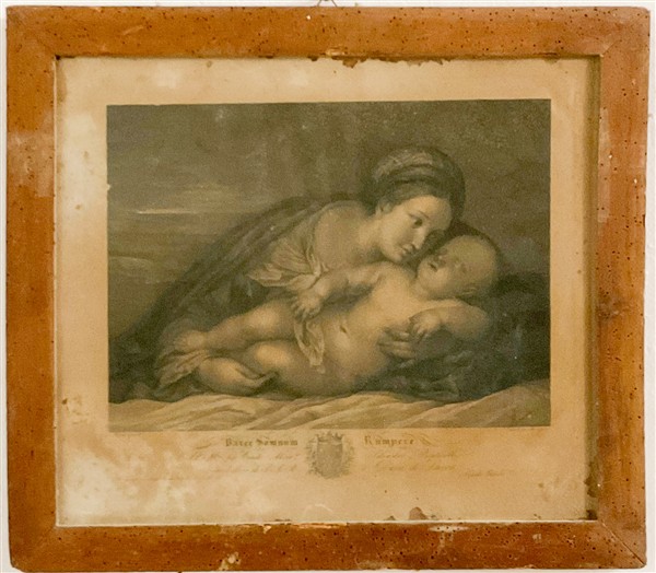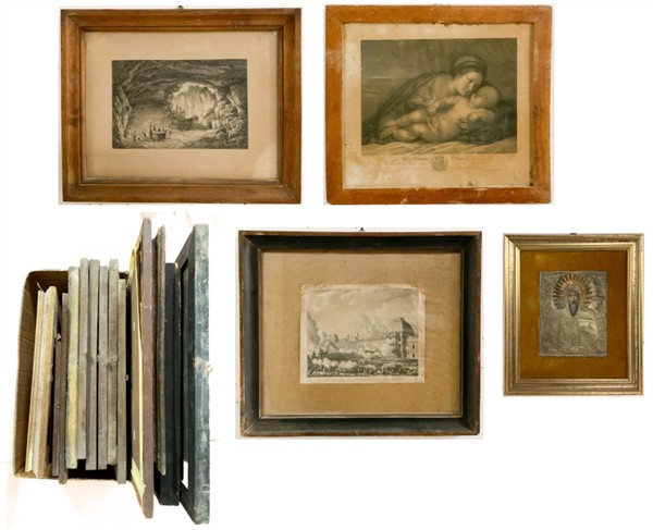 Cartone contenente numerose incisioni e stampe antiche di diverso formato e soggetto in cornice ed un'icona (difetti)