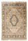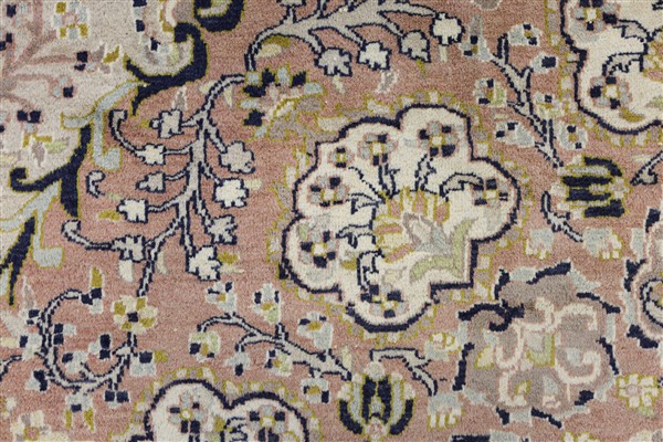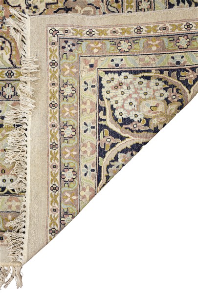 Tappeto Shrinagar, India, secolo XX. Decoro con medaglione a fondo bianco e blu su campo beige cosparso di rami fioriti. Bordura a meandro su fondo nero (cm 386x282) (difetti)