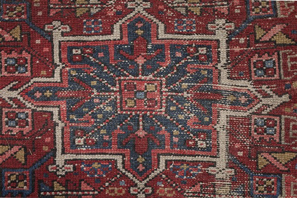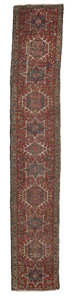 Tappeto passatoia Karadjià, confine Persia-Caucaso, secolo XX. Decoro con numerosi medaglioni di varie fogge su fondo rosso (cm 370x63,5) (difetti e rapature)