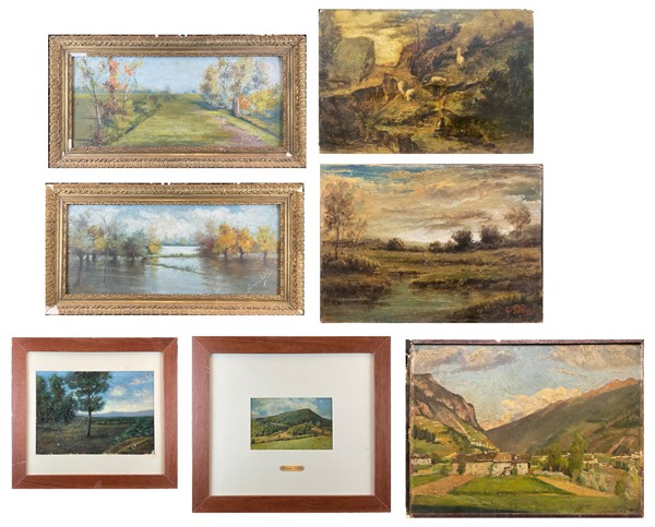 Lotto composto da sette dipinti ad olio raffiguranti "Paesaggi" su diversi supporti, di diversi autori, e misure