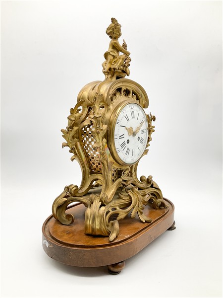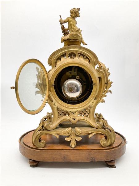 Pendola da appoggio in bronzo dorato con cassa riccamente decorata a motivi rocaille e sormontata da putto. Quadrante in smalto bianco a numeri romani per le ore e arabi per i minuti, movimento a due treni con suoneria delle ore e mezze su campanello. Francia, seconda metà del secolo XIX. Su base in legno di epoca successiva (h. totale cm 50) (difetti)